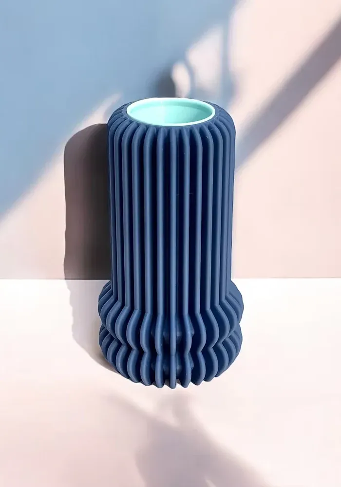 Vase Whimsy 100% Jean Blue strié, fabriqué avec une imprimante 3D.