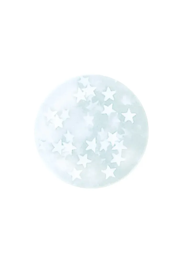 Vernis à ongles pour enfant, top coat avec des étoiles blanches et des paillettes holographiques.