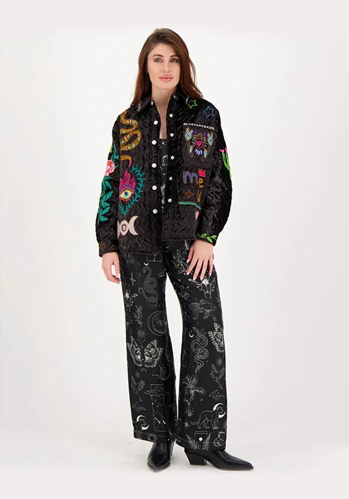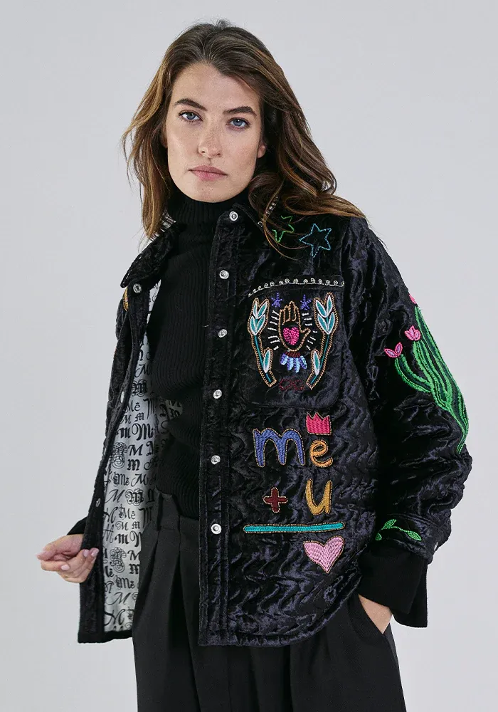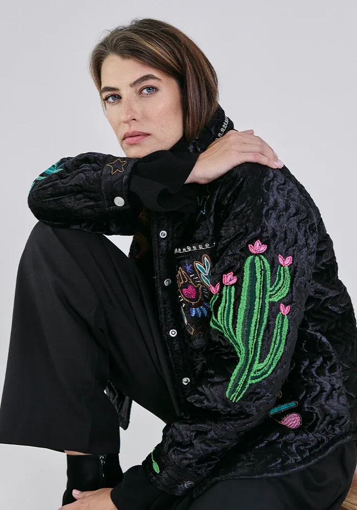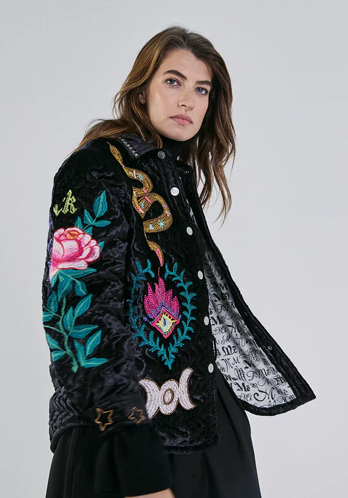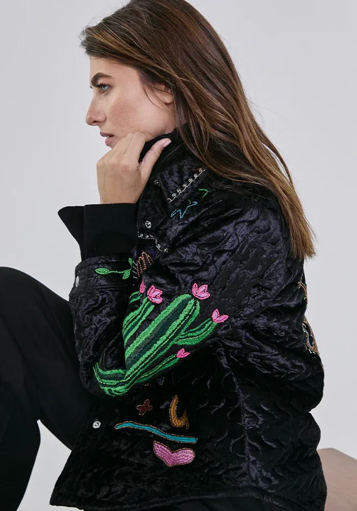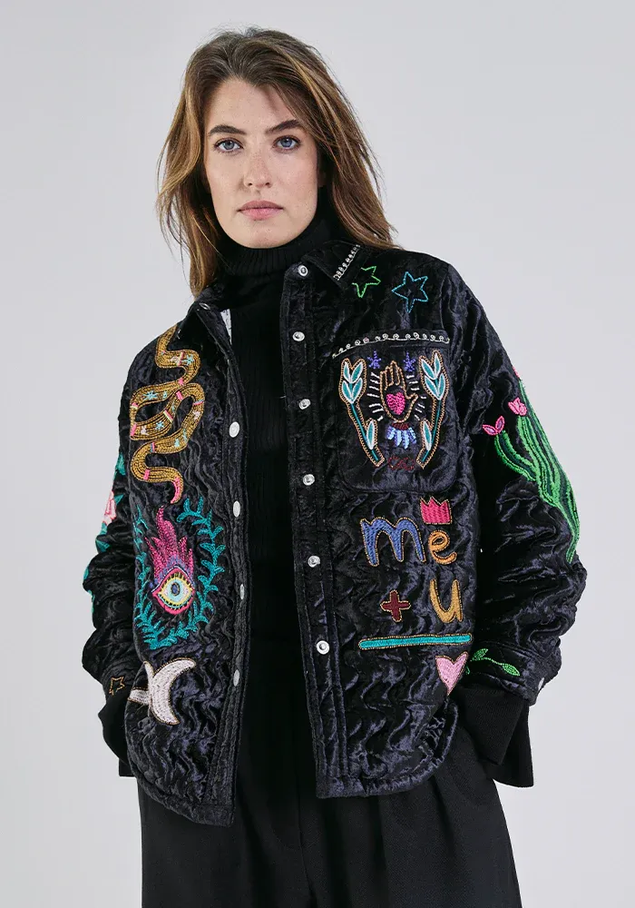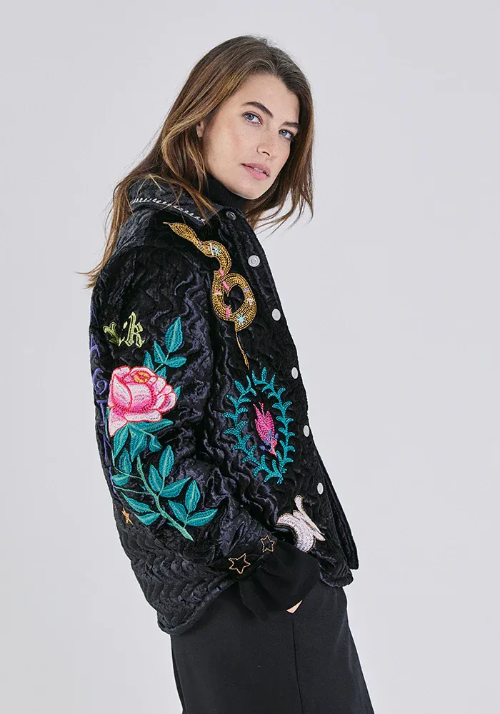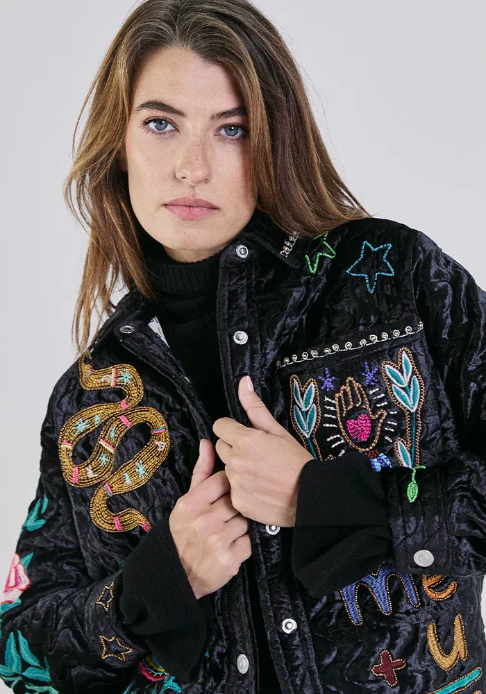 Veste Alicia courte en velours avec des surpiqures ton sur ton et des broderies multicolores.