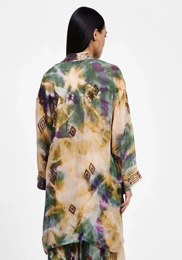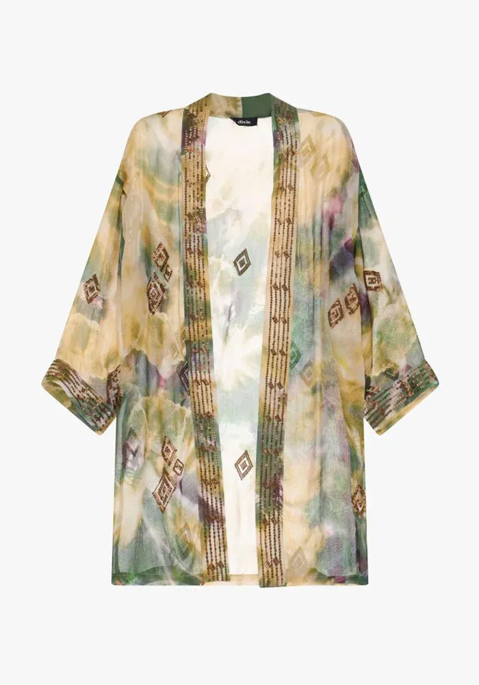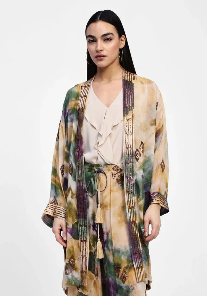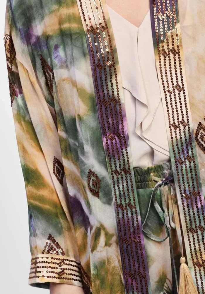 Veste Alix imprimée multicolore ouverte et fluide avec des motifs en sequins cuivrés.