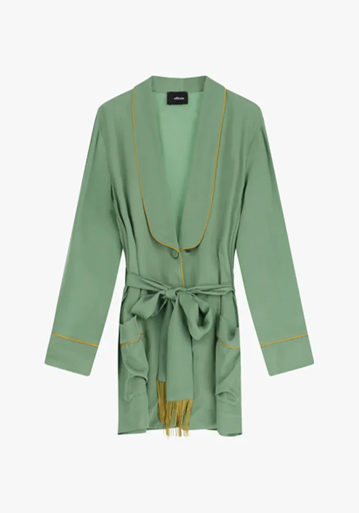 Veste peignoir court effet satiné vert avec des bordures et franges dorées.