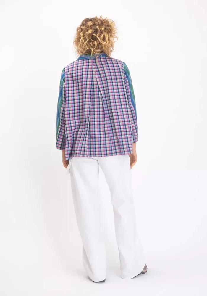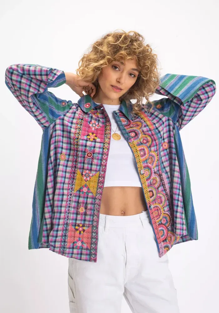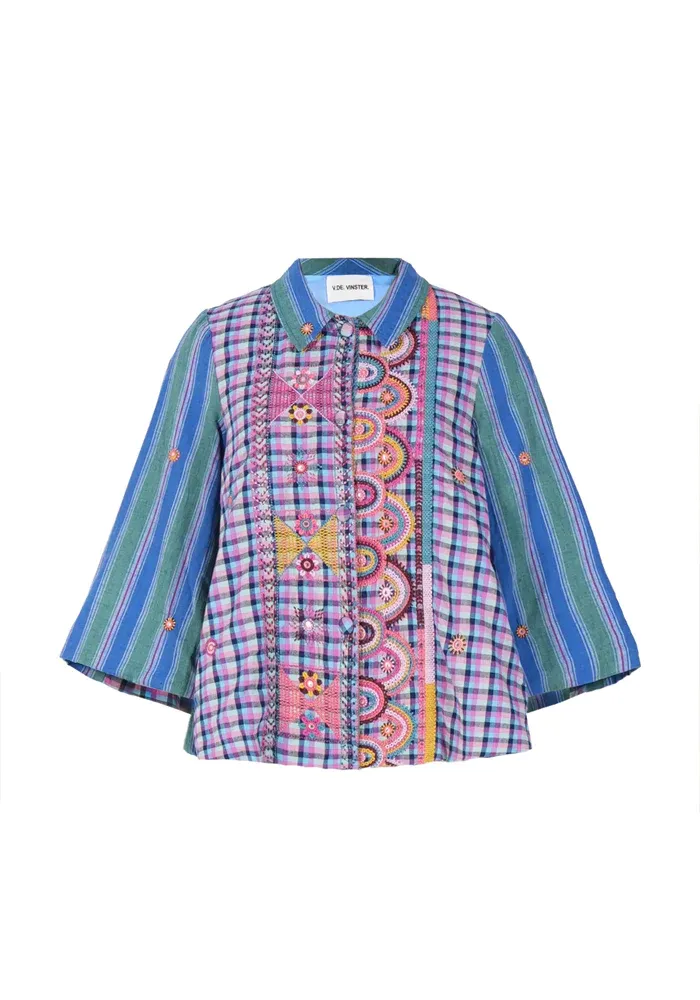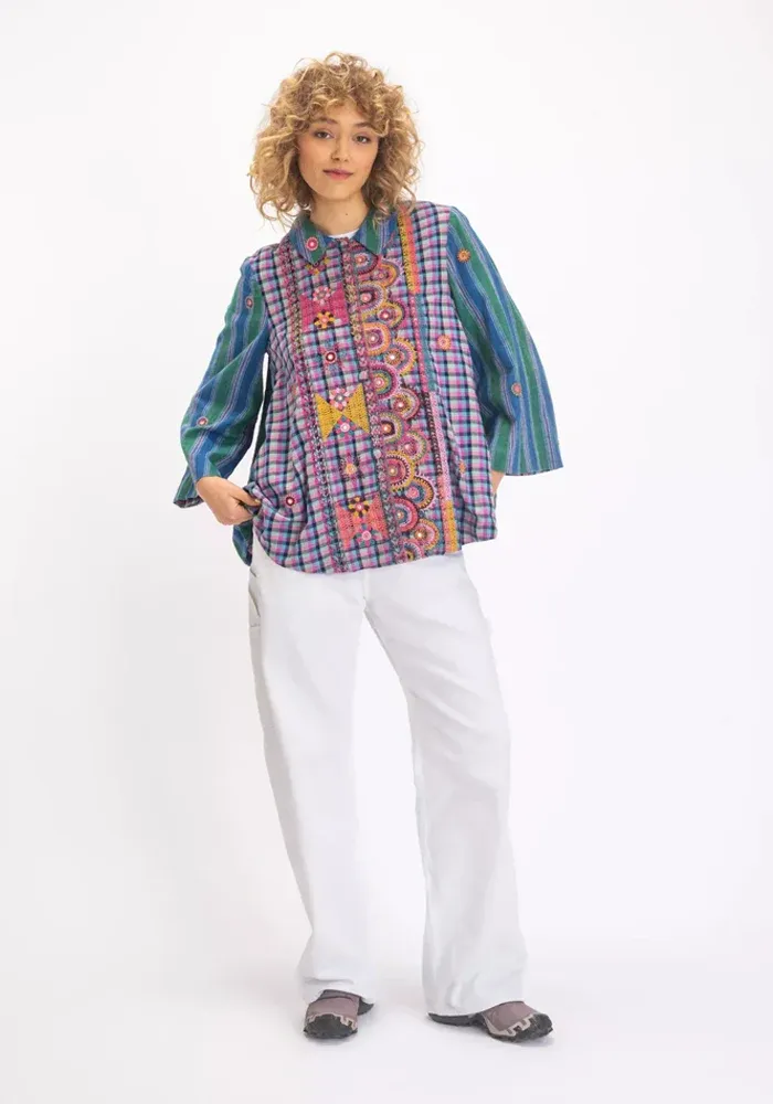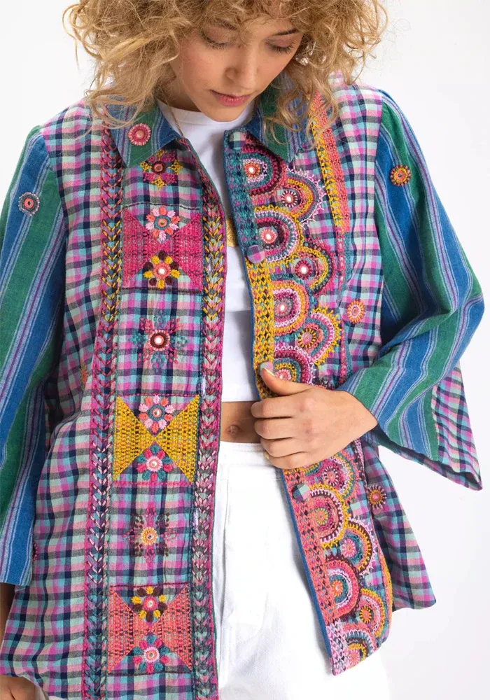 Veste Sita patchwork avec des manches évasées et décorées de broderies et petits miroirs.