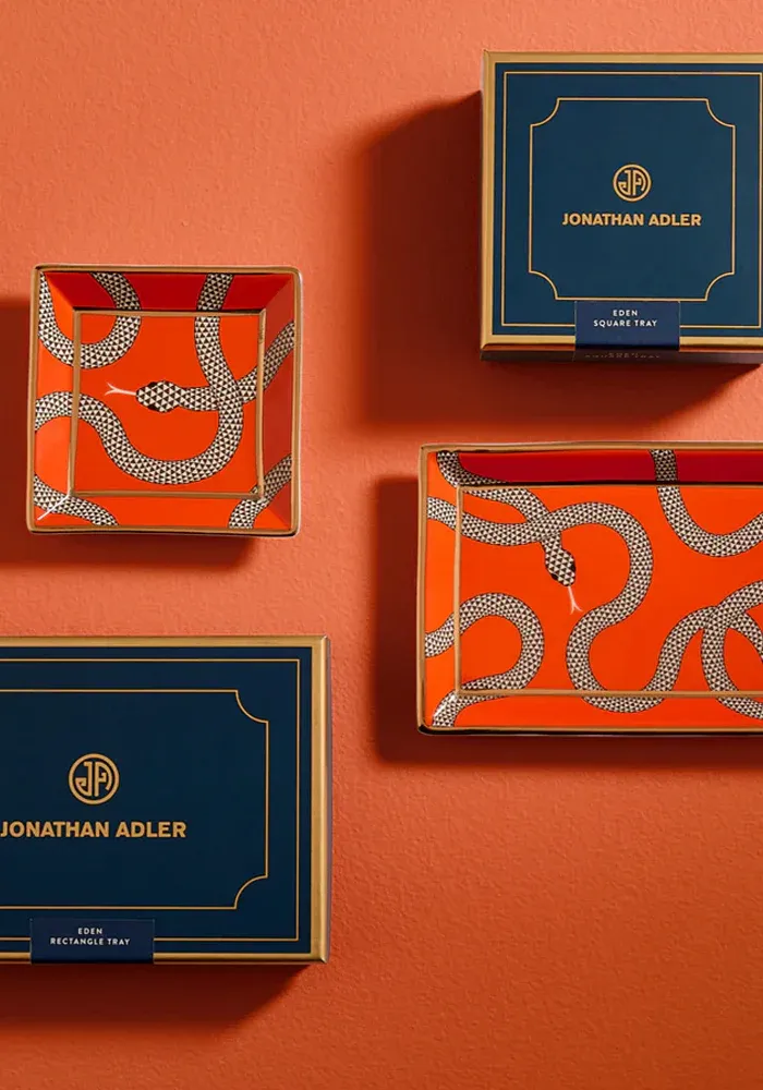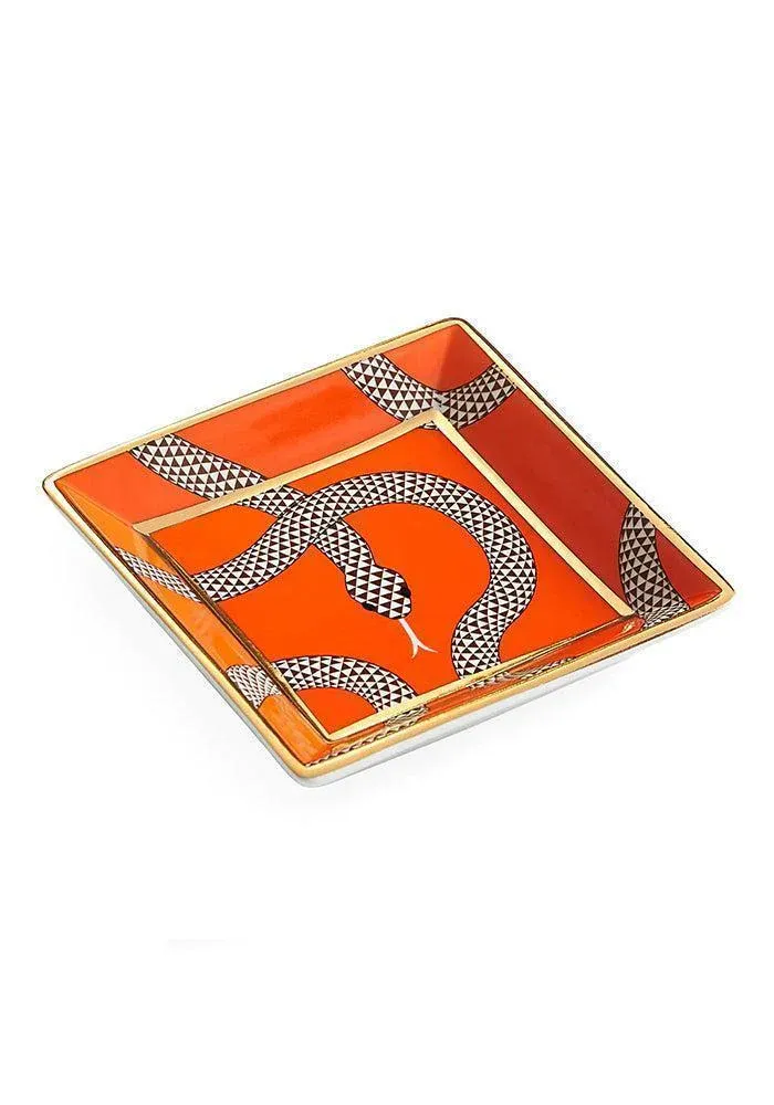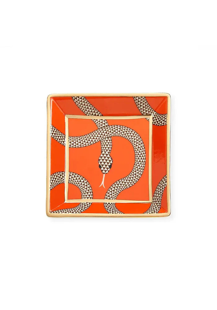 Vide-poche Eden carré en porcelaine à motif serpents sur fond orange.
