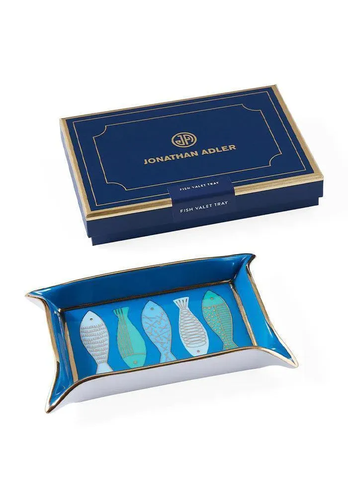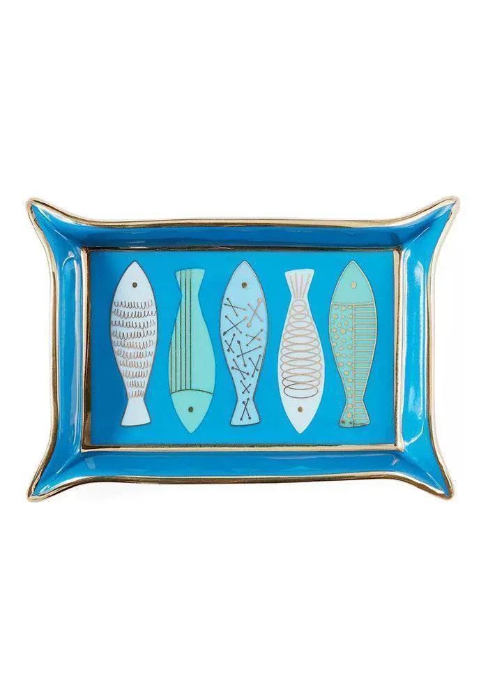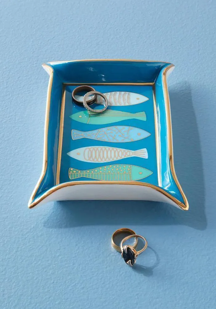 Vide poche rectangulaire Fish Valet en porcelaine bleu avec les angles pincés.