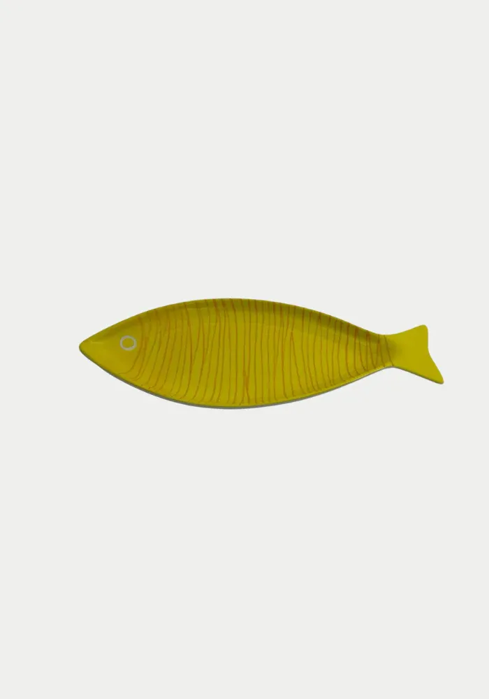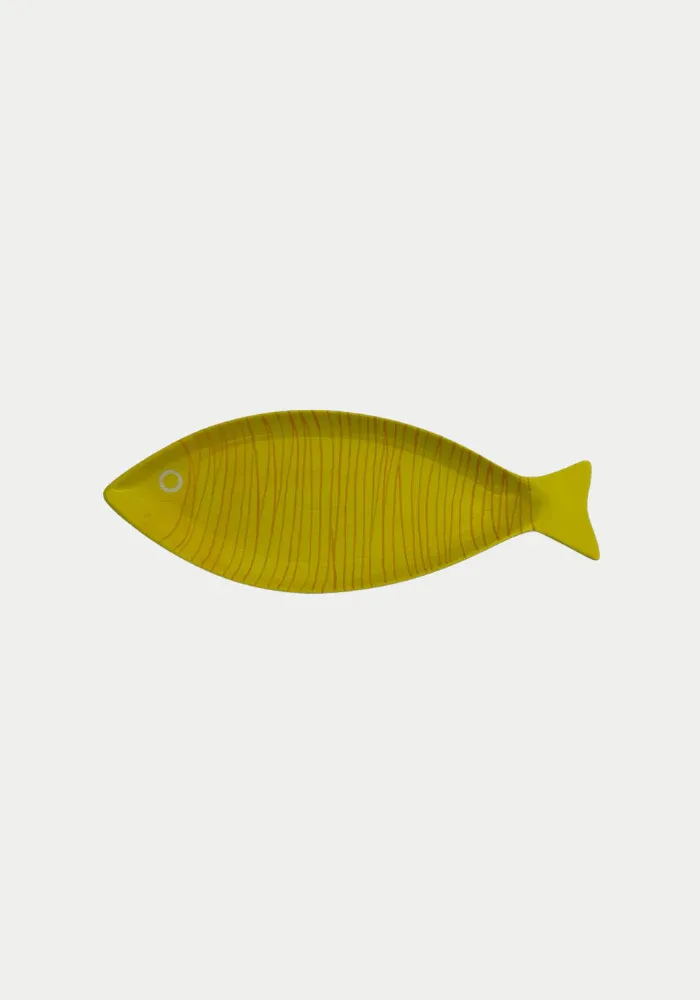 Vide-poche Lemon en céramique en forme de poisson, jaune avec détails orangés pour représenter les écailles du poisson.