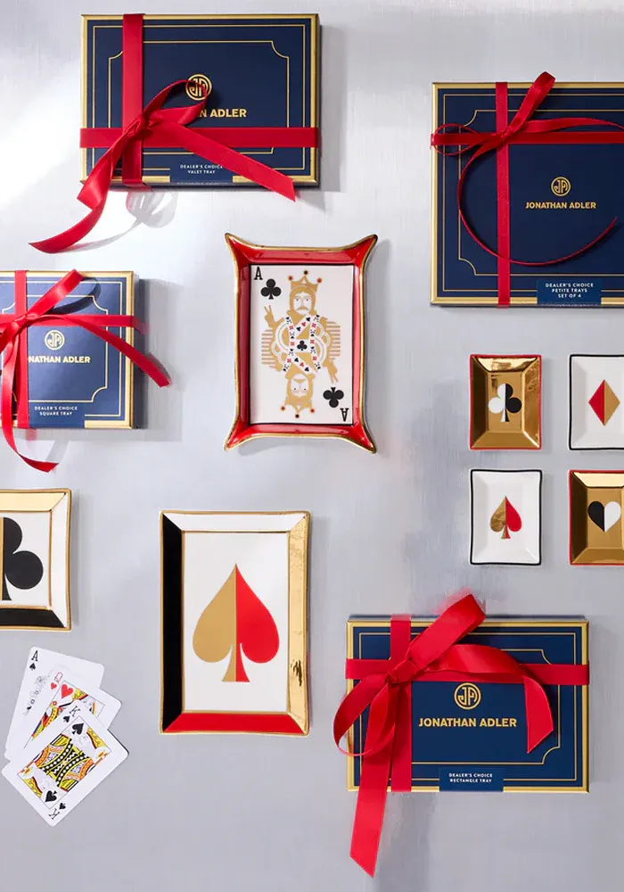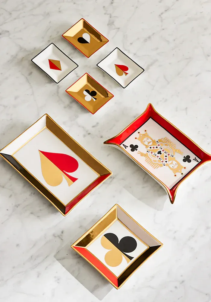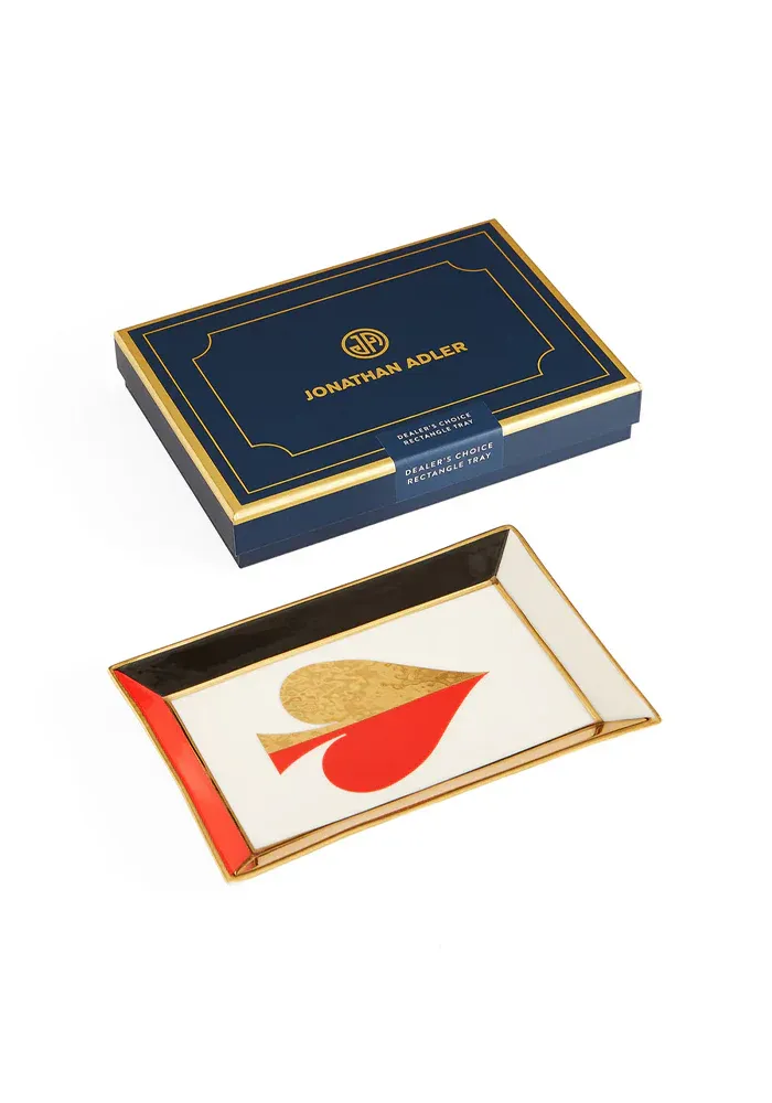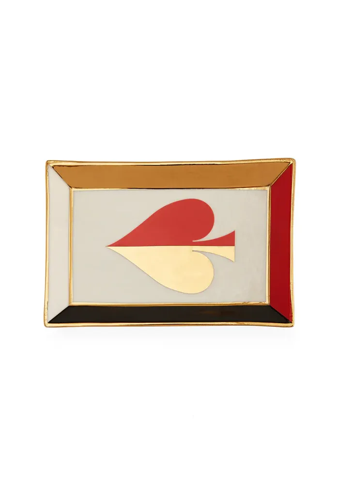 Vide Poche Dealer’s Choice rectangulaire avec le motif pique dans les tons de doré, rouge, beige et noir.
