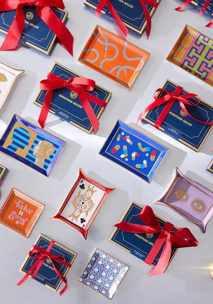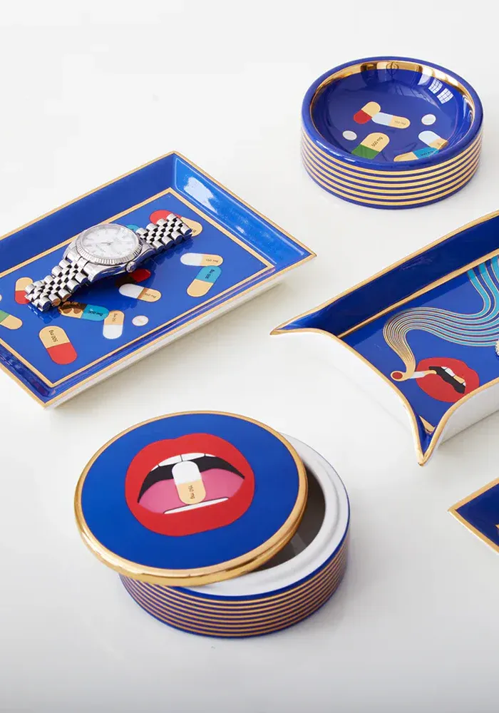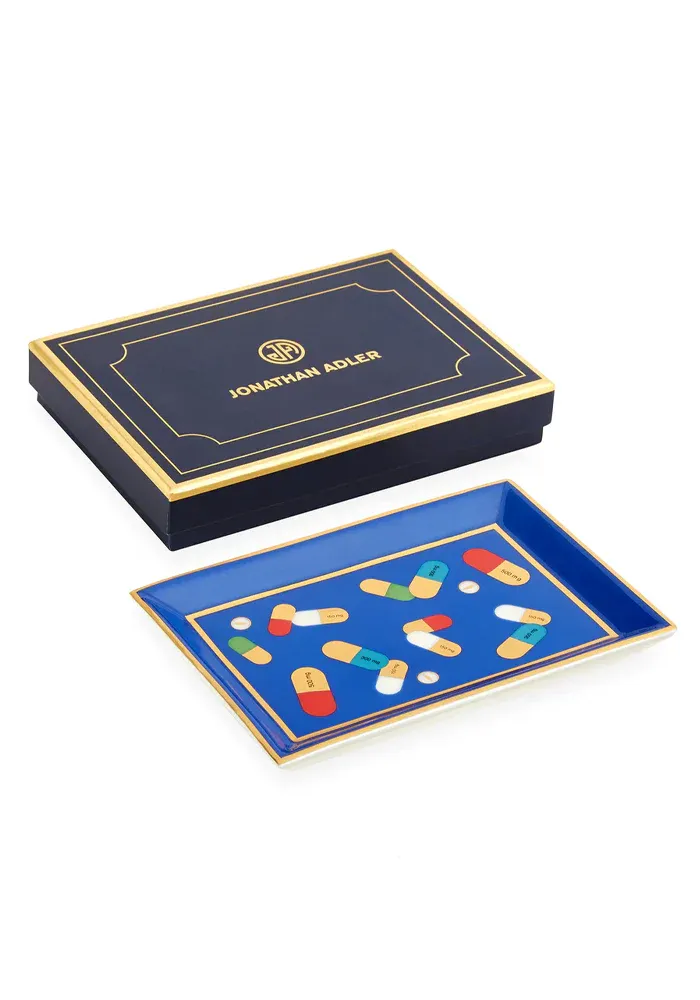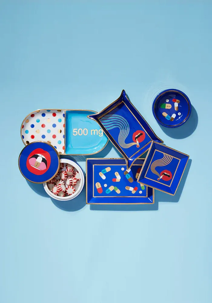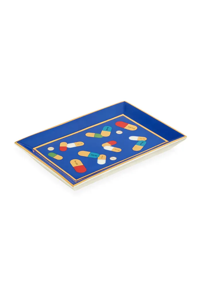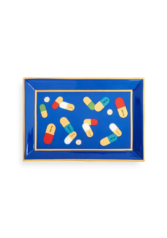 Vide Poche Full Dose rectangulaire bleu avec des mini pilules multicolores et dorées.