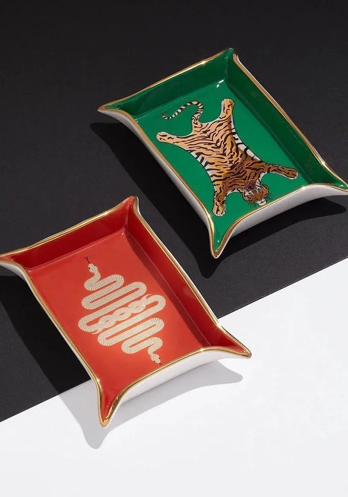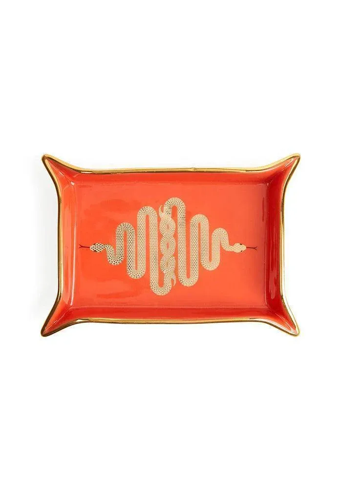 Vide poche rectangulaire Snake Valet en porcelaine orange avec les angles pincés.